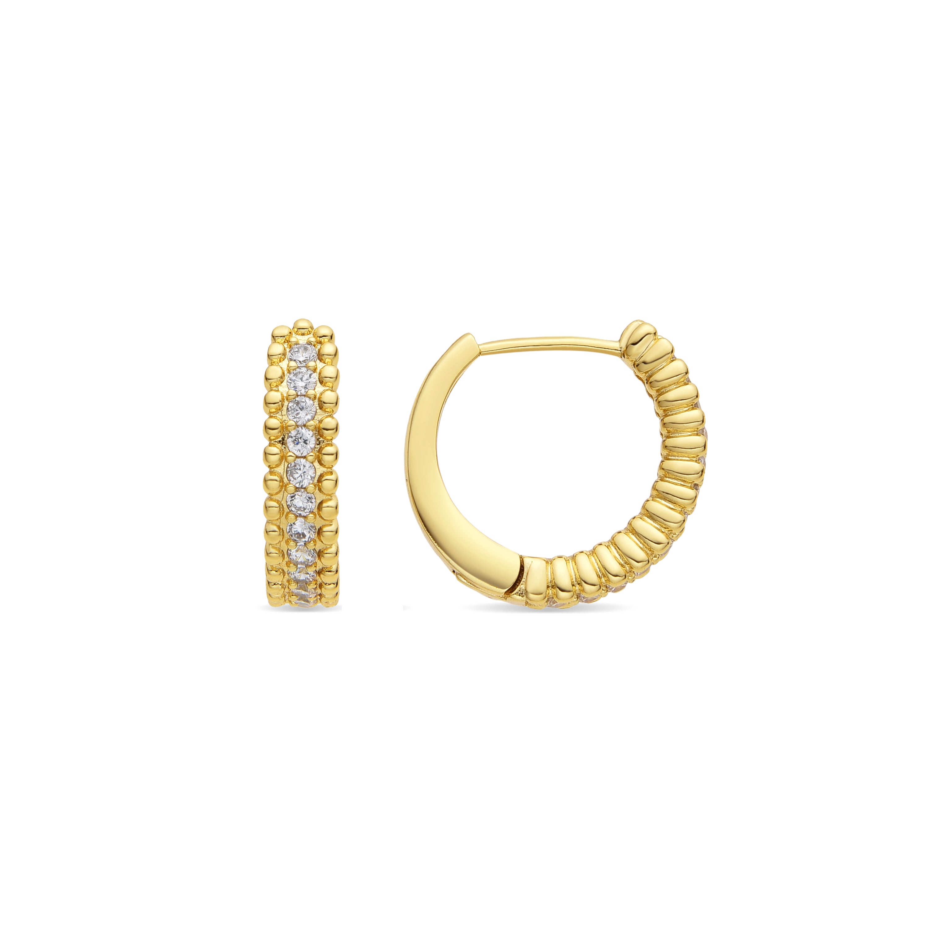 Pendientes Makang con Circonita Brillante acabado oro 18k. Essential encarna la sencillez refinada, piezas atemporales con líneas suaves y el brillo adicional de las circonitas. Joyas básicas sin pretensiones que son perfectas para el uso diario, pero también pueden funcionar en ocasiones especiales.