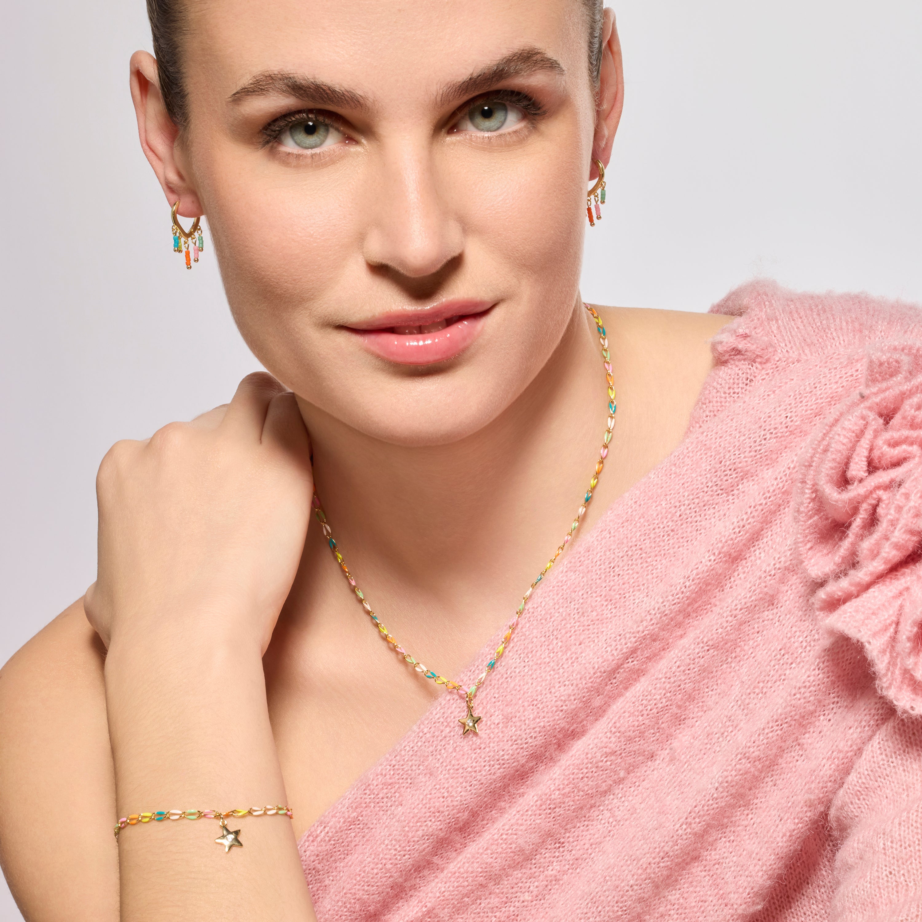 Los colgantes en forma de luna y estrella, las pulseras con charms cósmicos y los pendientes deslumbrantes son los protagonistas de esta colección. Los tonos multicolor, desde el azul profundo y el púrpura real hasta el dorado cálido y el dorado brillante, se combinan armoniosamente.