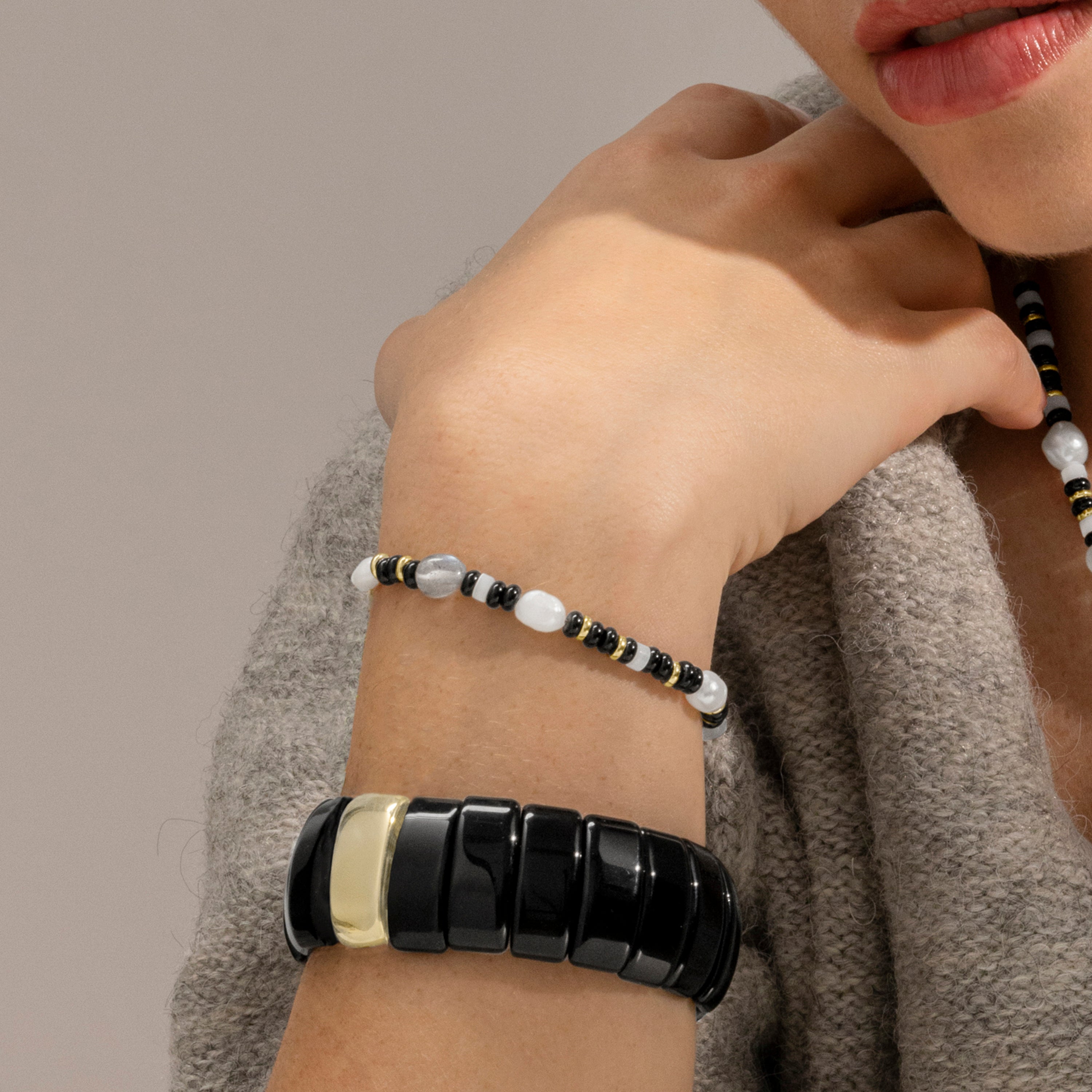 Pulsera Olahte con Onix acabado oro 18k. Trendy representa las tendencias clave en el mundo de la moda. Nuestra línea más espontanea, con un marcado espíritu moderno que concentra en joyas repletas de color entre las que destaca el uso de piedras naturales y diseños en forma de amuletos y talismanes.