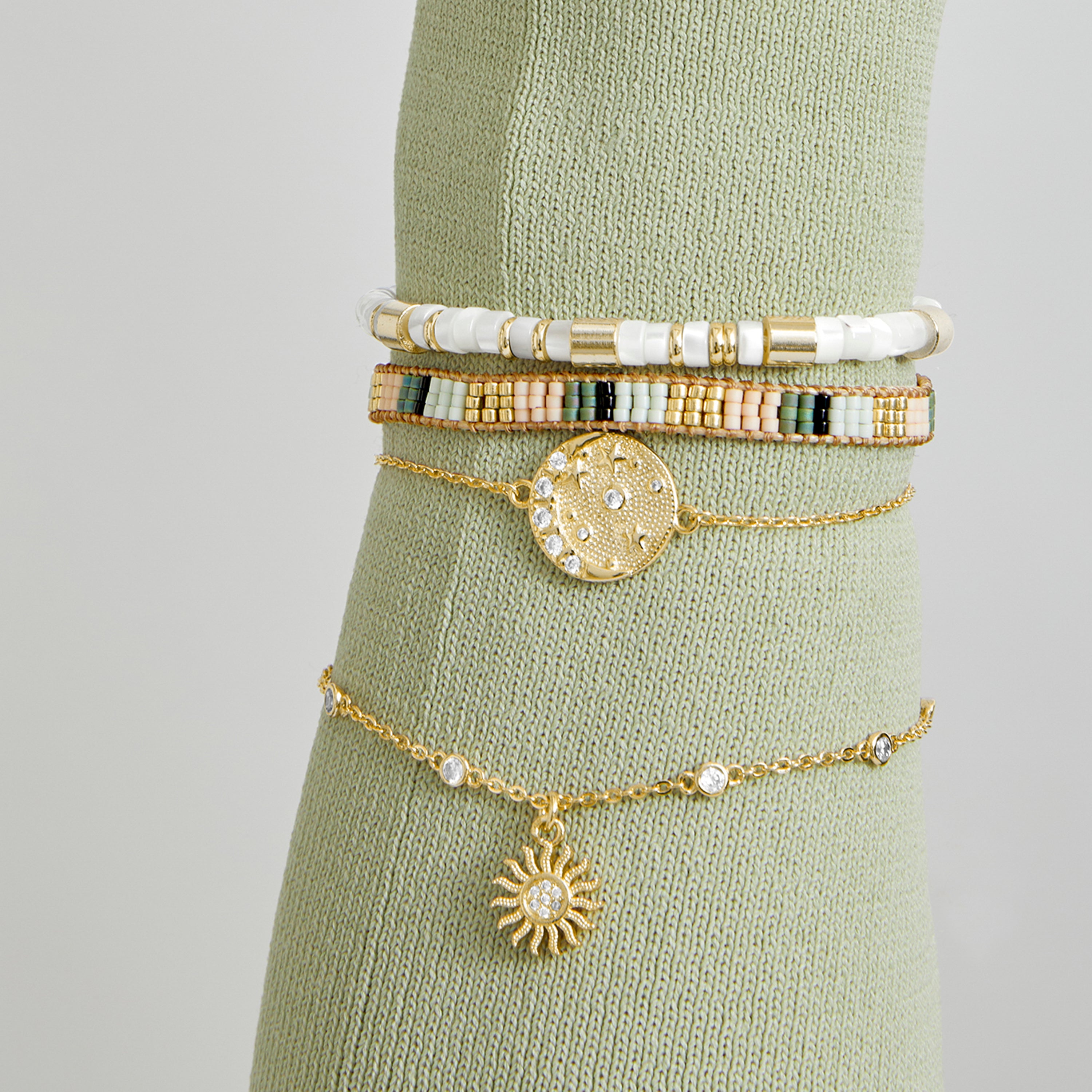 Pulsera Wicoy detalles en metal, cierre de Plata de Ley 925 y Madreperla Blanca acabada en oro amarillo de 18 quilates. Trendy representa las tendencias clave en el mundo de la moda. Nuestra línea más espontanea, con un marcado carácter boho y espíritu moderno que concentra en joyas repletas de color entre las que destaca el uso de piedras naturales y diseños en forma de amuletos y talismanes.