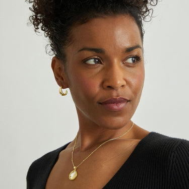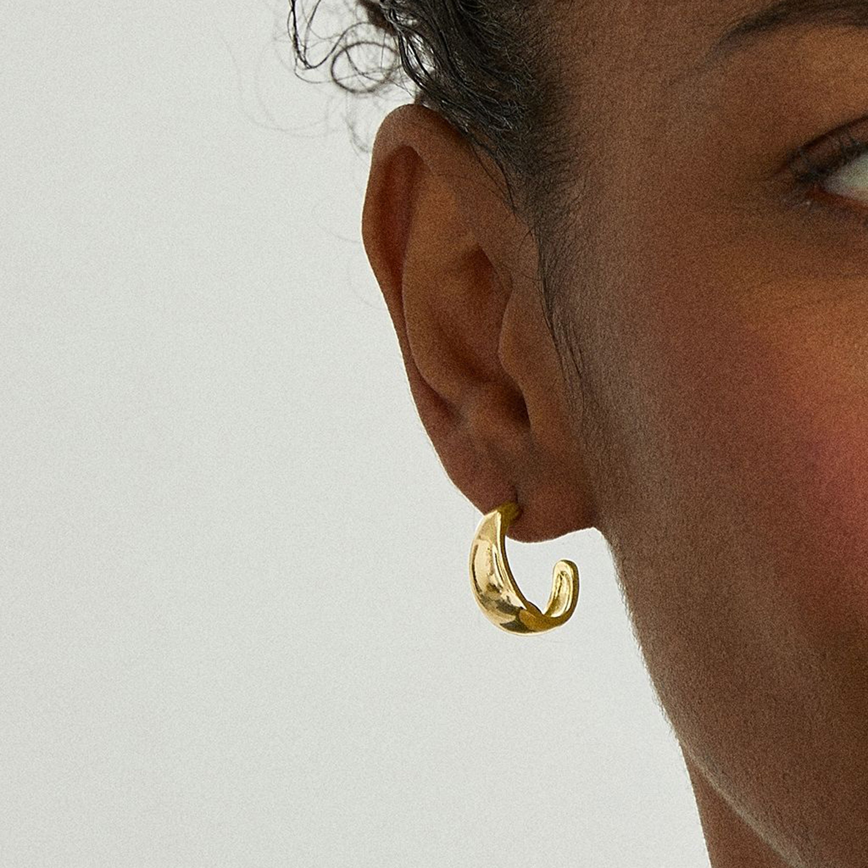 Brincos Ami acabados em ouro amarelo 18K. África Basic encarna a simplicidade refinada, peças intemporais com linhas suaves e o brilho adicional das zircónias. Joias básicas e despretensiosas que são perfeitas para o uso diário, mas que também funcionam em ocasiões especiais.