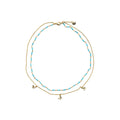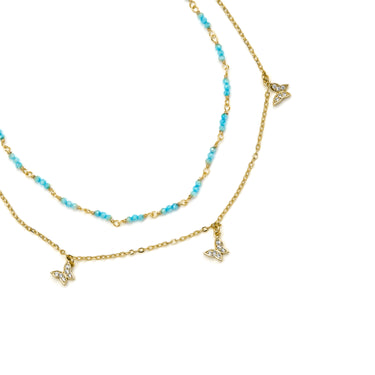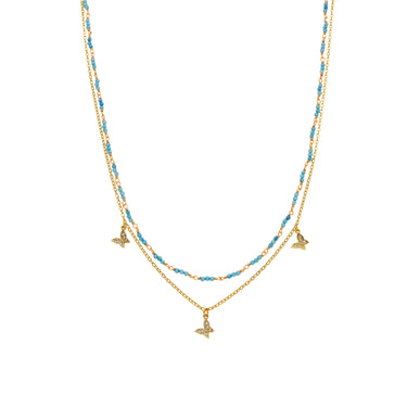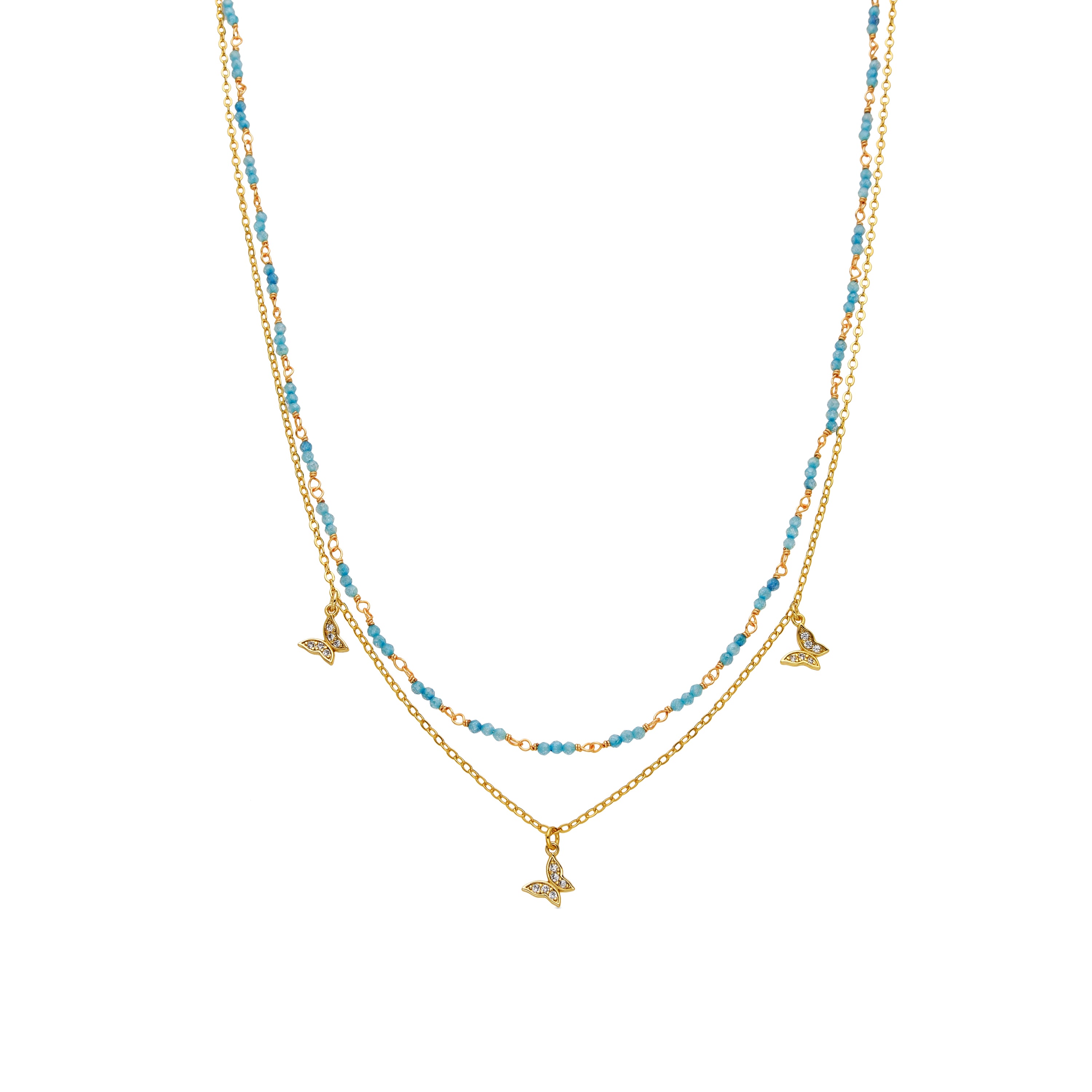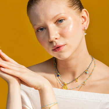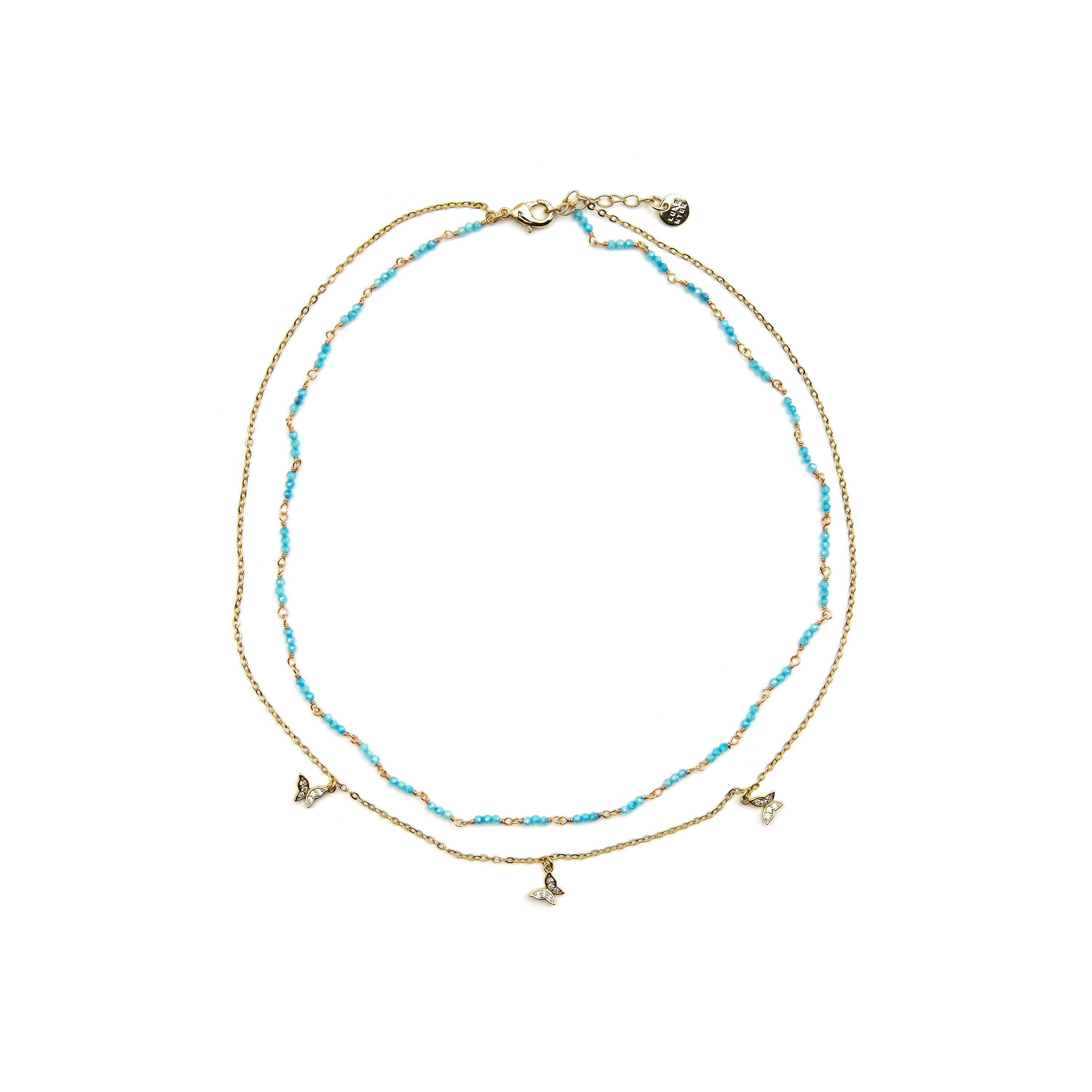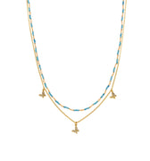 Colar de metal Zinli com Cristal Azul acabamento em ouro 18k. O estilo Boho é uma estética de espírito livre que mistura diferentes culturas e expressões artísticas num estilo eclético com ênfase nos elementos orgânicos e na natureza.