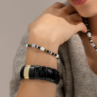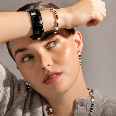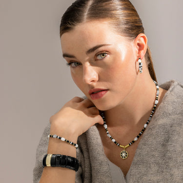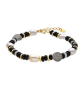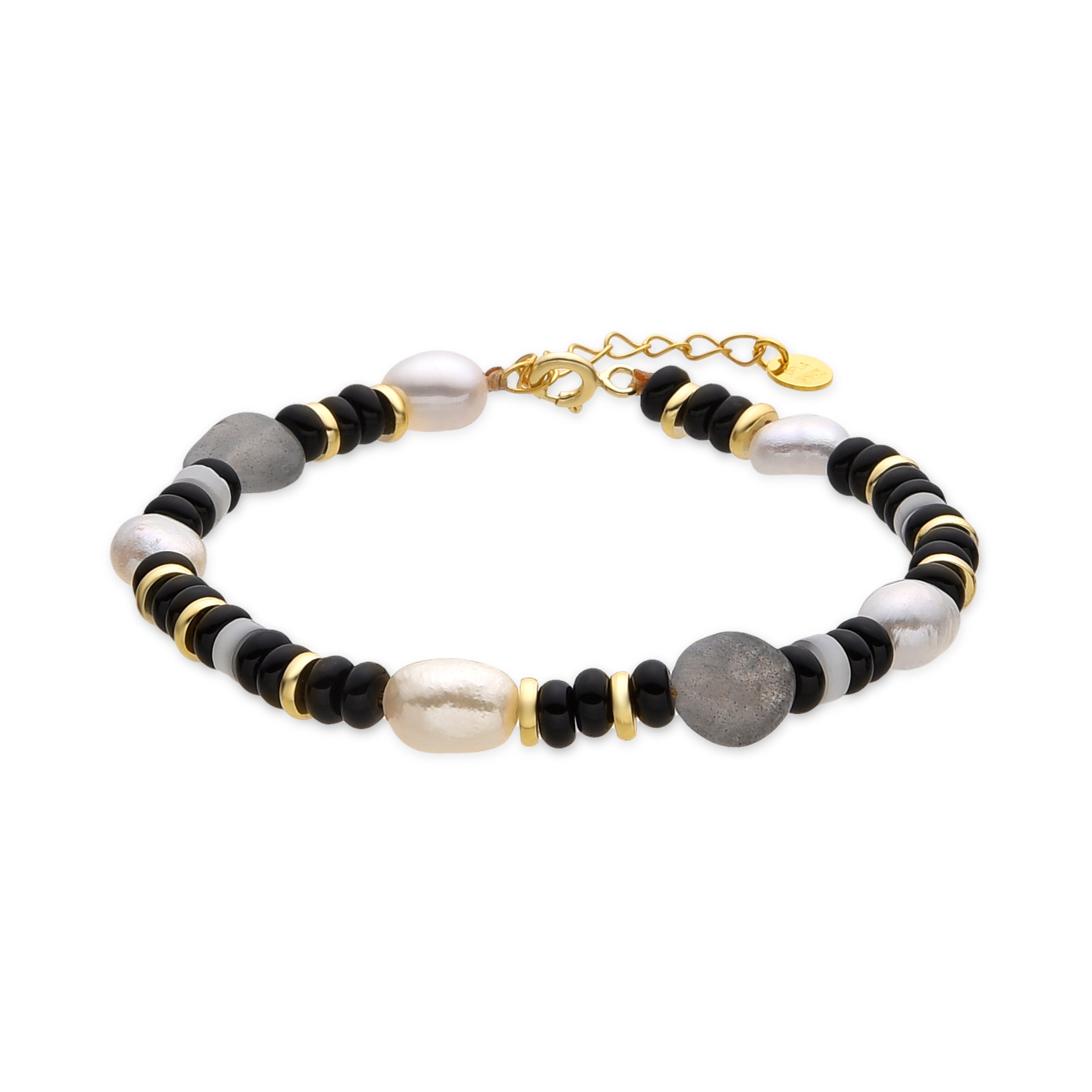 Pulseira Nanys com fecho em Prata de Lei 925, contas de metal e Ônix com acabamento em ouro 18k. Trendy representa as tendências chave no mundo da moda. A nossa linha mais espontânea, com um espírito moderno marcado que se concentra em joias repletas de cor, destacando o uso de pedras naturais e designs em forma de amuletos e talismãs.
