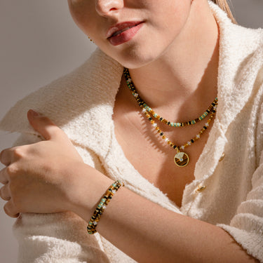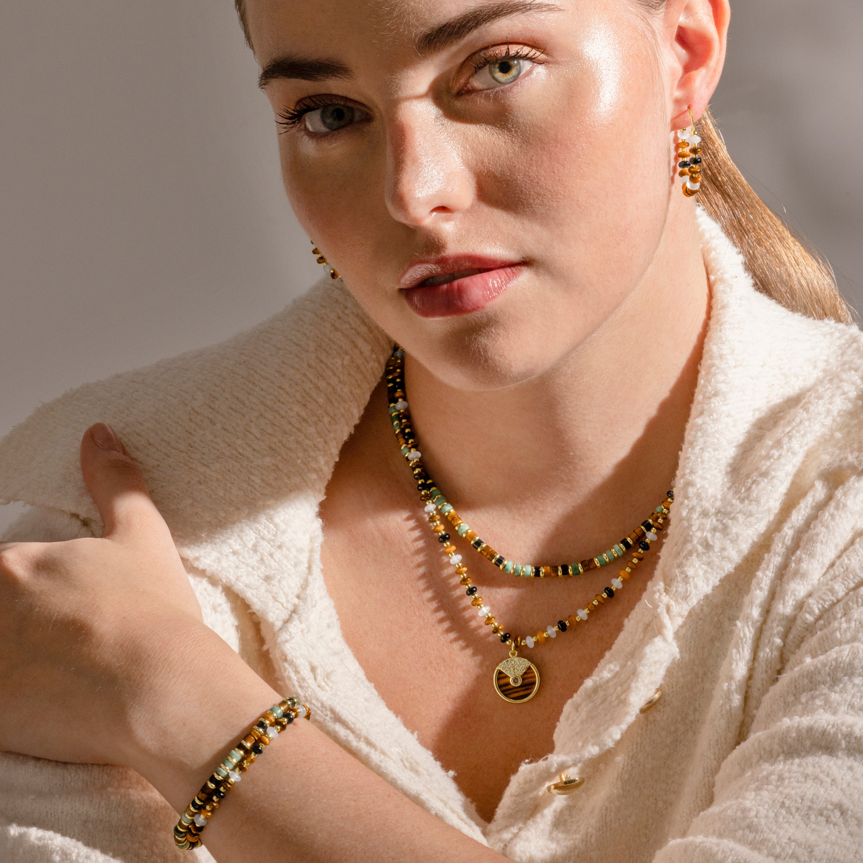 Pulseira Yalah fecho de Prata de Lei 925, contas de metal e Olho de Tigre acabamento em ouro 18k. Trendy representa as tendências chave no mundo da moda. A nossa linha mais espontânea, com um espírito moderno marcado que se concentra em joias repletas de cor, entre as quais se destaca o uso de pedras naturais e designs em forma de amuletos e talismãs.